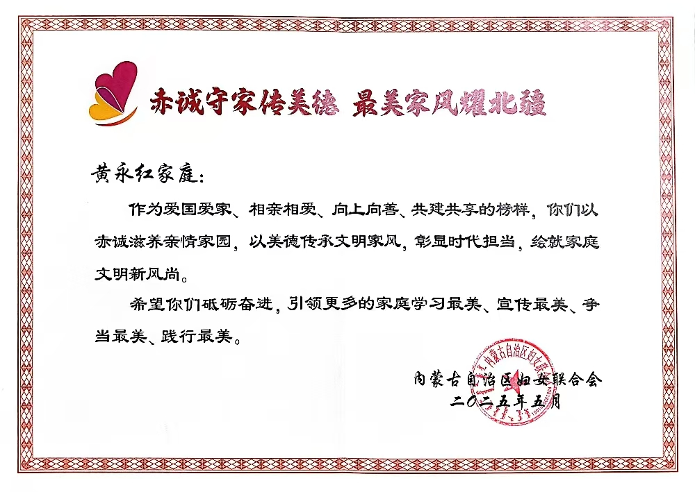 近日,內蒙古自治區婦聯向全社會發布2024年度“最美家庭”,中國二冶職工黃永紅家庭榮獲2024年度自治區“最美家庭”榮譽稱號。