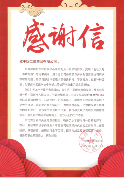 8月30日,鄂州市武昌學校向中國二冶發來感謝信,充分肯定了中國二冶湖北分公司在鄂州市武昌學校項目中展現出的奮勇拼搏與不懈努力,為鄂州市武昌學校小學部九月份開學奠定了堅實基礎。
