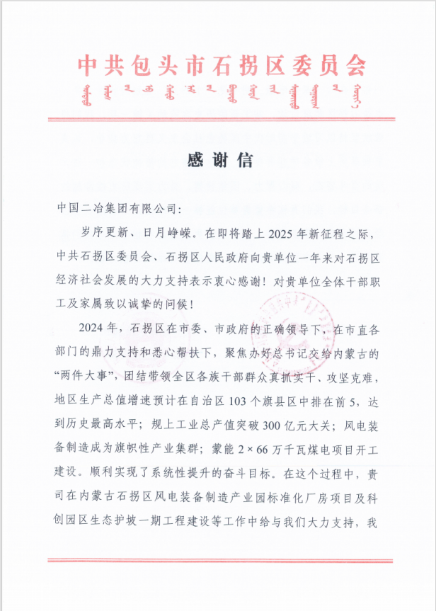 信中指出,2024年,石拐區(qū)在市委、市政府的正確領(lǐng)導(dǎo)下,在市直各部門的鼎力支持和悉心幫扶下,聚焦辦好習(xí)近平總書記交給內(nèi)蒙古的“兩件大事”,團(tuán)結(jié)帶領(lǐng)全區(qū)各族干部群眾真抓實干、攻堅克難,地區(qū)生產(chǎn)總值增速預(yù)計在自治區(qū)103個旗縣區(qū)中排在前5,達(dá)到歷史最高水平;規(guī)上工業(yè)總產(chǎn)值突破300億元大關(guān);風(fēng)電裝備制造成為旗幟性產(chǎn)業(yè)集群;蒙能2×66萬千瓦煤電項目開工建設(shè)。順利實現(xiàn)了系統(tǒng)性提升的奮斗目標(biāo)。在這個過程中,中國二冶在內(nèi)蒙古石拐區(qū)風(fēng)電裝備制造產(chǎn)業(yè)園標(biāo)準(zhǔn)化廠房項目及科創(chuàng)園區(qū)生態(tài)護(hù)坡一期項目等工程建設(shè)中給予大力支持,我們銘記在心、深懷感激。明年是“十四五”規(guī)劃的收官之年,也是石拐區(qū)爬坡過坎、站上新的歷史臺階的關(guān)鍵一年。我們將繼續(xù)堅持以習(xí)近平新時代中國特色社會主義思想為指導(dǎo),認(rèn)真貫徹落實上級各項部署要求,以永不懈怠的精神狀態(tài)和一往無前的奮斗姿態(tài),凝心聚力、團(tuán)結(jié)拼搏,奮力實現(xiàn)歷史性跨越的奮斗目標(biāo)。