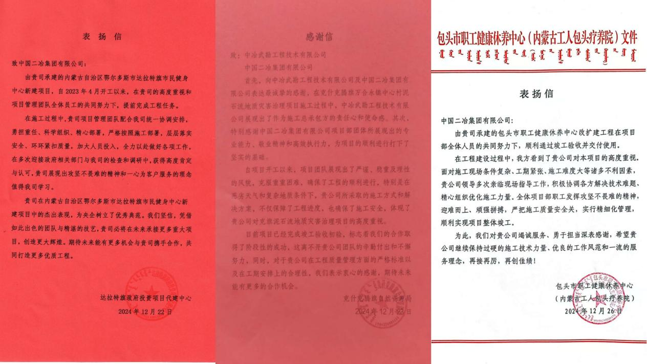 近日,中國(guó)二冶先后收到來(lái)自達(dá)拉特旗政府投資項(xiàng)目代建中心、克什克騰旗自然資源局以及包頭市職工健康休養(yǎng)中心的三封表?yè)P(yáng)信。信中高度贊揚(yáng)了中國(guó)二冶在達(dá)旗健民中心項(xiàng)目、赤峰泥石流項(xiàng)目、包頭康養(yǎng)項(xiàng)目建設(shè)中展現(xiàn)出的卓越專業(yè)能力、嚴(yán)謹(jǐn)施工態(tài)度以及為地方經(jīng)濟(jì)社會(huì)發(fā)展作出的積極貢獻(xiàn)。
